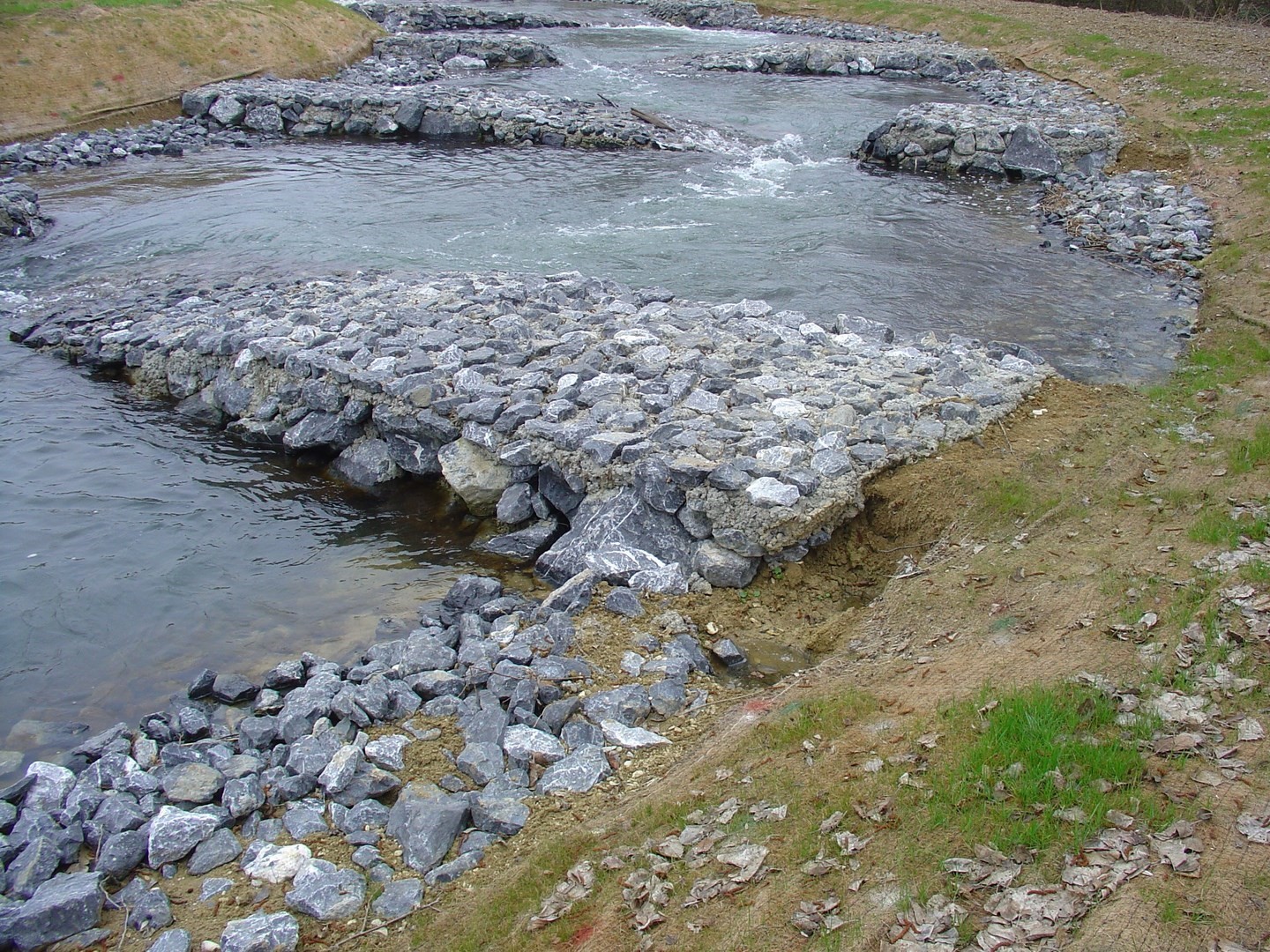 Terrassement des bassins par déblai / remblai ; dispositif de géomembrane pour l’étanchéité ; recouvrement des fonds par des blocs et ensemencement des berges.